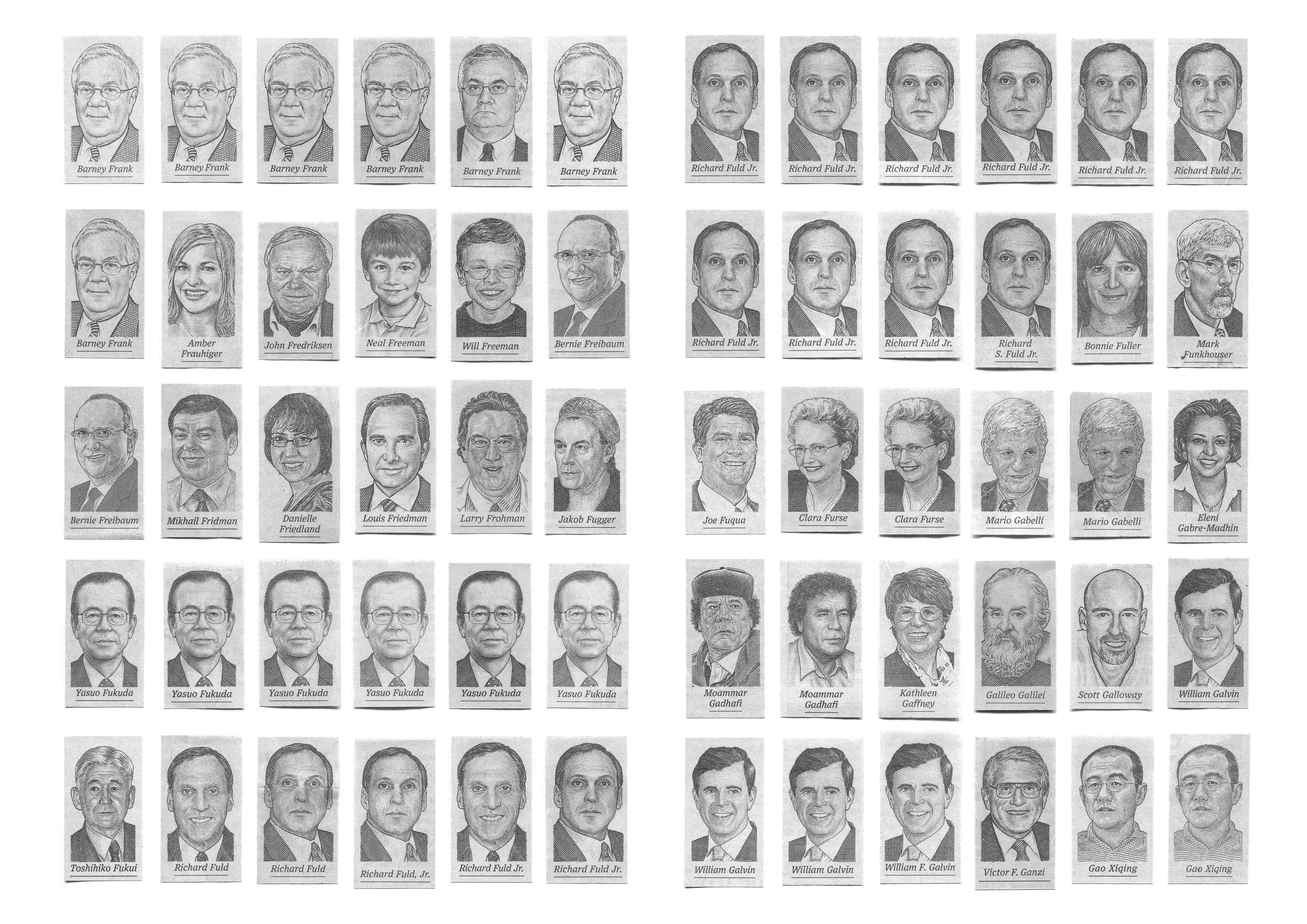 The Wall Street Journal introduced the stipple drawings known as hedcuts in 1979 to add character to their then text-heavy publication. The signature style of portraiture has since become an icon of newsworthiness. The Class of 2008 is an alphabetical catalogue of every hedcut published in 2008. In cases where an individual was featured multiple times, repetitions are included and appear chronologically.