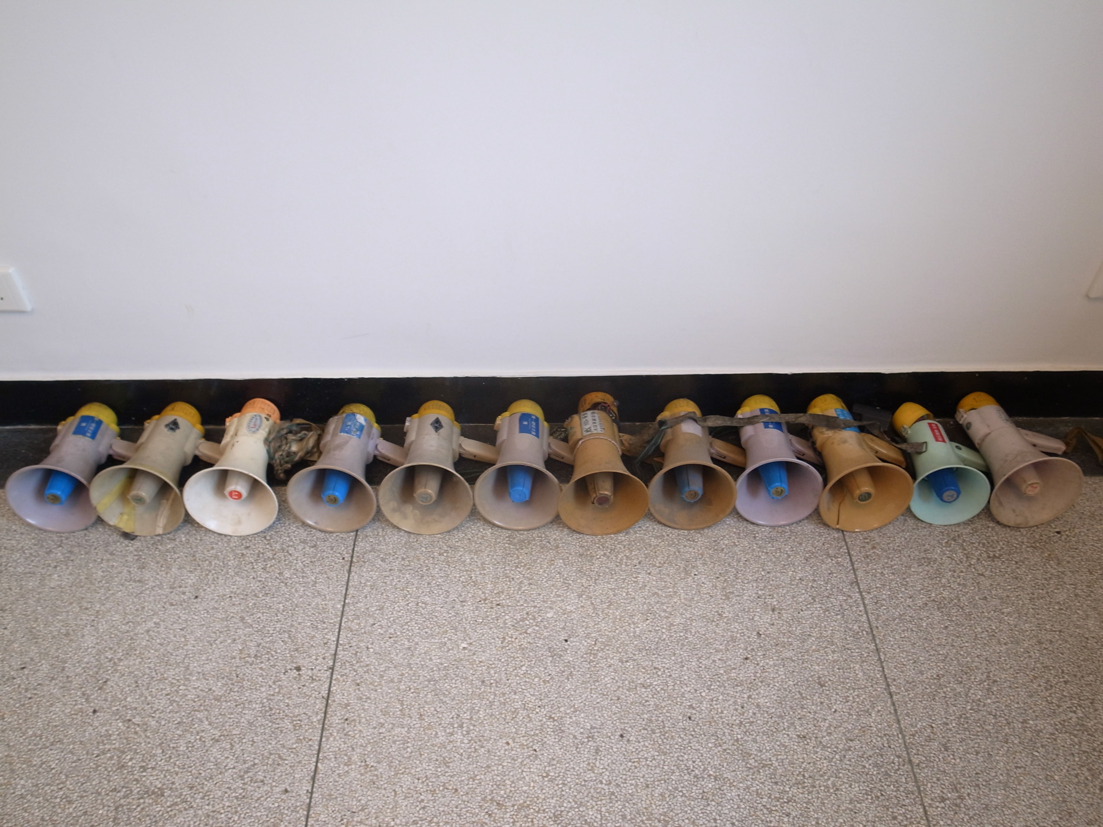 , is a collection of megaphones acquired from Beijing street vendors retaining original recorded advertisements.