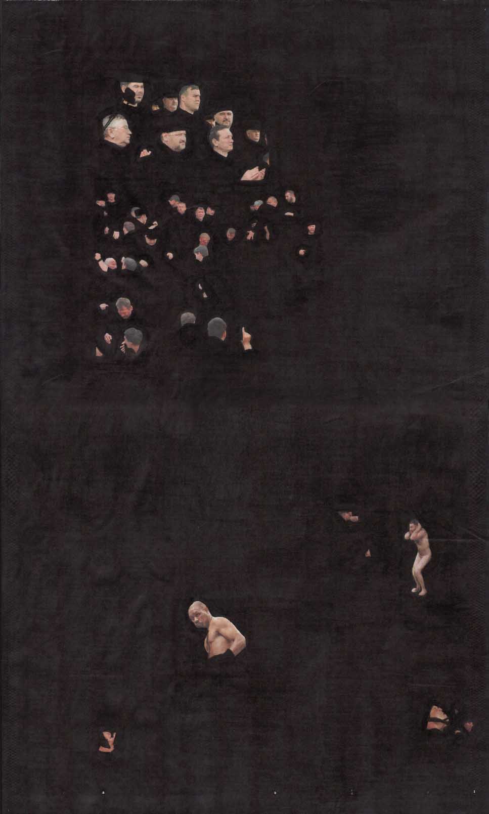 , is made from newspaper pages that have been blacked-out by maker except where images of humans appear (detail of one front page).